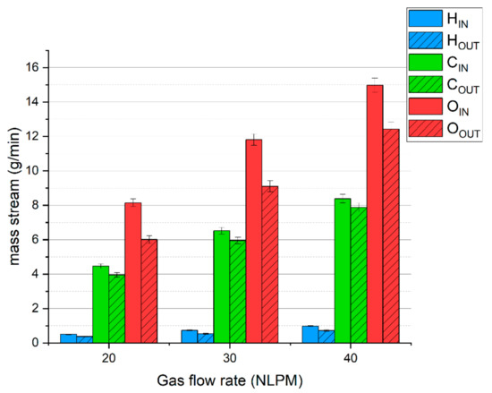 To complement these results, Figure 3 presents the balance of hydrogen, carbon, and oxygen. The average deficiencies of these elements are ca. 26%, 9%, and 22%, respectively. A high lack of hydrogen and oxygen is caused by the presence of steam, which was not analyzed, but was produced according to reaction (7). The lack of carbon is due to the presence of olefins (mostly acetylene) and hydrogen cyanide. The presence of these compounds was confirmed in our previous research [31].