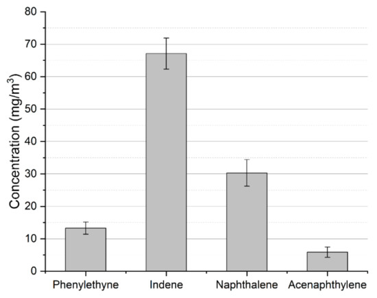 While most of the toluene is converted into valuable carbon monoxide and hydrogen due to interaction with carbon dioxide and steam (produced via reaction (7)) [16,31], part of it is converted into other aromatic compounds. The concentration of these compounds in the process gas is presented in Figure 4. Besides these heavier compounds, the other aromatic byproduct is benzene. Its concentration was determined to be 1.65 ± 0.22 g/Nm3. The presence of these products might be problematic. In the case of heavier aromatic hydrocarbons, the problem is connected to the tar dew point—the temperature at which the tar starts to condense. In opposition to toluene, which condenses at a rather low temperature, heavier aromatics, e.g., indene, naphthalene, and acenaphthylene, increase the tar dew point. Benzene, on the other hand, while not problematic in the context of tar condensation, is rather unwanted in the case of fuel cells or synthesis processes as it may create a carbon deposit on anodes and catalysts [32,33].
