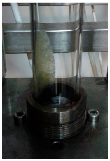 It is worth mentioning that reaction (12) might be another factor responsible for the drop in hydrogen sulfide conversion when methane was added. Besides these three gaseous products, i.e., carbonyl sulfide, sulfur dioxide, and carbon disulfide, the conversion of hydrogen sulfide also leads to the production of elementary sulfur deposits (Figure 5). These deposits, being S2 condensed on the reactor’s walls, were observed in the tests with pure nitrogen and with the addition of hydrogen and carbon monoxide. They were not observed in the case with carbon dioxide. With methane addition, the carbon deposits did not allow the condensed sulfur to be observed.