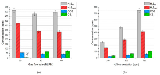 Concentration of the gaseous sulfur compounds depending on: (a) gas flow rate and (b) initial hydrogen sulfide concentration. *—concentration below the calibration range.