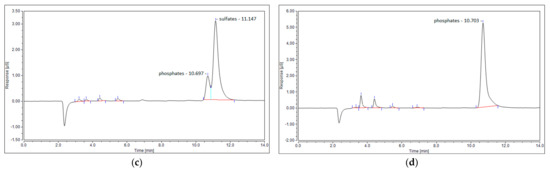 The last possible reason for no sulfur dioxide detection could be its reaction with steam, created via reaction (7), and the formation of sulfuric acid. This phenomenon was observed in the work of S.M. Ali Mousavi et al. [28]. To verify this phenomenon, ion chromatography tests were conducted for four samples: the blank test with pure ionized water, the sample obtained for the test with the N2+CO2+H2S mixture, and the samples obtained from the test with simulated syngas (20 NLPM and 30 NLPM). As shown, the peak obtained for the test with simulated syngas and 20 NLPM (Figure 9c) is similar in shape to the peak obtained for the test with the N2+CO2+H2S mixture (Figure 9b). There was no possibility to specify or quantify these ions, but the results clearly suggest that the outlet gas stream contains sulfates. On the other hand, the case with simulated syngas and 30 NLPM lacks a clear sulfates’ peak (Figure 9d), although it is possible that it could be overlapped by the previous one that was assigned to phosphates. This difference between the tests with 20 NLPM and 30 NLPM is somehow consistent with the distribution of sulfur products. In the case of 20 NLPM, there is a significantly higher lack of S compared to the case of 30 NLPM. This is indicated by the sum of the distribution of sulfur products, which is ca. 87% for the former one and ca. 97% for the latter (Figure 7). It is possible that the remaining sulfur is contained in sulfates. Nevertheless, in the cases other than 20 NLPM, these sulfur lacks are reasonably within the error bars, and it might be assumed that the sulfate concentration is rather negligible and that majority of the sulfur is contained within hydrogen sulfide, carbon disulfide, and carbonyl sulfide.
