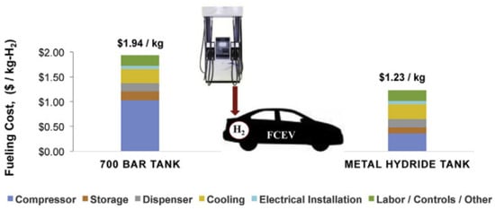 - Frank, E.D.; Elgowainy, A.; Khalid, Y.S.; Peng, J.-K.; Reddi, K. Refueling-station costs for metal hydride storage tanks on board hydrogen fuel cell vehicles. Int. J. Hydrogen Energy 2019, 44, 29849–29861. [Google Scholar] [CrossRef]