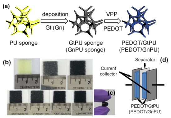 In this study, carbon materials (graphite nanoplatelets and graphene nanoplatelets) deposited sponges were fabricated by the “dip and dry” technique with commercially available macro open-cell structured polyurethane (PU) sponge. The graphite nanoplatelet deposited PU sponge (GtPU sponge) and the graphene nanoplatelet deposited PU sponge (GnPU sponge) were employed as the substrates for the polymerization of PEDOT, and the vapor phase polymerization (VPP) method was applied to synthesize PEDOT. Compared to other polymerization methods of PEDOT, the VPP method has produced more crystalline PEDOT with relatively high conductivity [,]. The simplicity and the substrate-adaptability of the VPP method benefitted the electrode preparation and material design significantly [,]. The resulting PEDOT/GtPU and PEDOT/GnPU composite sponges were applied as the electrodes to assemble symmetric supercapacitors, respectively. The effects of the deposited carbon material (graphite or graphene nanoplatelets) and VPP temperature on the capacitive performance were determined utilizing CV, CD characterization and electrochemical impedance spectroscopy. With the optimized composition and conditions, the resulting composite electrodes in this research exhibited high areal specific capacitance and excellent capacitance retention, and the flexibility of the electrodes allow the fabrication of flexible supercapacitors in the future research. The good capacitive performance, the simplicity of the fabrication process, and the low-cost materials make the resulting composite electrodes a competitive candidate for commercial application.