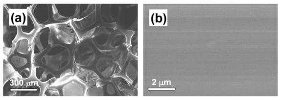 To obtain optimal capacitive performance, an effective solution is to fabricate carbon-containing composites with electrochemically active species as electrodes, which can achieve high capacitance via electric double layer mechanism and electrochemical reactions [,,]. Recently, commercial sponges/foams with macropores have been used as the substrate or the scaffold for the active materials to fabricate supercapacitor electrodes. The macroporosity of the sponge substrate guaranties accessibility to the electrode surface, and the microporosity and mesoporosity of the active materials provide high surface areas [,,]. A variety of pseudocapacitive materials with this kind of structure have been utilized in supercapacitor electrodes. Ren et al. fabricated graphene foam/polypyrrole composites via a chemical vapor deposition method and a chemical interfacial polymerization method as stretchable supercapacitor electrode materials. The all-solid-state supercapacitor assembled with the resulting composite showed an areal specific capacitance of 258 mF cm−2 []. Liang et al. prepared a supercapacitor electrode material by growing NiCo2S4 nanosheets on the compressible carbon sponge. The produced electrode achieved a specific capacitance of 1093 F g−1 []. Moon et al. used a commercial sponge as the substrate to fabricate ZnCo2O4/reduced graphene oxide composite through a hydrothermal reaction. A symmetric supercapacitor was assembled with the composite sponge, and a specific capacitance of 1116.6 F g−1 was obtained at a scan rate of 2 mV s−1 in aqueous electrolyte [].