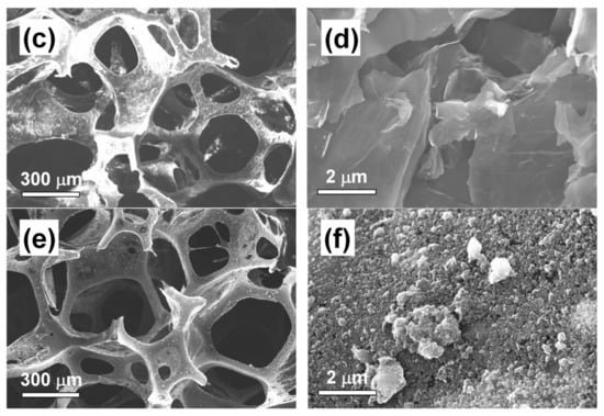 Scanning electron microscopy (SEM) images of PU sponge, GtPU sponge and GnPU sponge under differing levels of magnification. (a,b) for PU sponge, (c,d) for GtPU sponge, (e,f) for GnPU sponge.