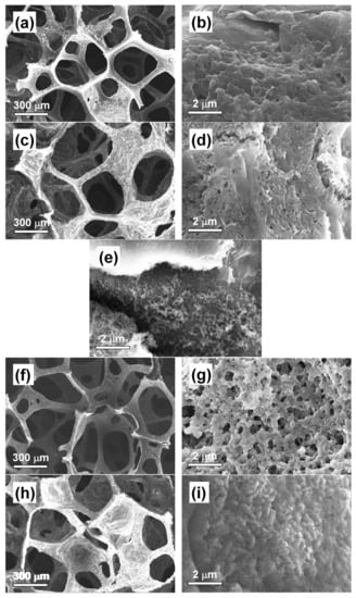 The prepared GtPU and the GnPU sponges were used as the substrates for VPP processing of PEDOT. All the composite sponges maintained the macroporous open-cell structure of the bare PU sponge (Figure 4a,c,f,h), however, the surface morphology was significantly changed by the growth of PEDOT. In Figure 4b, the outlines of graphite nanoplatelets were faintly visible on 50 PEDOT/GtPU sponge, most graphite nanoplatelets were attached by the continuous irregularly shaped PEDOT, and no mature porous structure formed by PEDOT. As the polymerization temperature of PEDOT increased to 110 °C, the graphite nanoplatelets were no longer visible due to the higher yield of PEDOT than at 50 °C. Diverse morphologies were obtained on 110 PEDOT/GtPU sponge. Most of the surfaces were covered by PEDOT with many crevices scattered all over (Figure 4d). In some valleys, another kind of morphology was observed. A small amount of PEDOT grew into nano-scale accretive particles (Figure 4e). Other than VPP temperature, different carbon materials deposited on PU sponge also caused the differences in morphology. In 50 PEDOT/GnPU sponge, well-formed submicron-sized porous structures were built by continuous PEDOT, and no graphene nanoplatelets were observed. As the polymerization temperature of PEDOT increased to 110 °C, the coral structure of PEDOT was developed widely with massive nano-scale holes in it. In addition, nano-scale PEDOT particles were also found in 110 PEDOT/GnPU sponge. The sheet resistance values of these composite sponges were also measured with the four-point probe method, and the value for 50 PEDOT/GtPU was 93 Ω/square, 425 Ω/square for 110 PEDOT/GtPU, 273 Ω/square for 50 PEDOT/GnPU, and 817 Ω/square for 110 PEDOT/GnPU. After the polymerization of PEDOT, the resistance values of the composite sponges were decreased significantly compared to their substrates GtPU and GnPU. The decrease in resistance was due to part of the PEDOT polymerized on GtPU and GnPU bridging the carbon flakes as a conductive binder. As the polymerization temperature increased from 50 °C to 110 °C, the yield of PEDOT was promoted, and more PEDOT was not acting as the conductive binder. In this case, the lower conductivity of PEDOT than graphite and graphene nanoplatelets led to the slight decrease in conductivity of the composite sponges when the polymerization temperature increased from 50 °C to 110 °C.