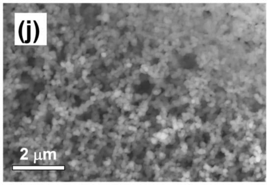 SEM images of 50 PEDOT/GtPU, 110 PEDOT/GtPU, 50 PEDOT/GnPU, 110 PEDOT/GnPU composite sponges under differing levels of magnification. (a,b) for 50 PEDOT/GtPU, (c–e) for 110 PEDOT/GtPU, (f,g) for 50 PEDOT/GnPU, (h–j) for 110 PEDOT/GnPU.