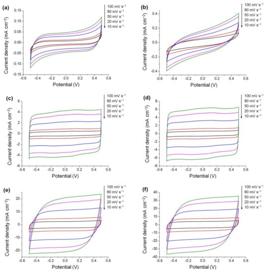 GtPU, GnPU and the composite sponges prepared with them at different VPP temperatures were employed as electrode materials for supercapacitors, and the assembled cells were studied by cyclic voltammetry (CV) at scan rates from 10 to 100 mV s−1 as shown in Figure 5. The CV curves of GtPU sponge electrodes (Figure 5a) and GnPU sponge electrodes (Figure 5b) both exhibited spindly, or highly distorted rectangular shape, indicating the poor conductivity of the electrodes. Graphite and graphene nanoplatelets are both highly conductive materials, however, the failed connection between scattered nanoplatelets on insulating PU scaffold led to the poor conductivity. After PEDOT was polymerized onto GtPU or GnPU sponge at 50 °C, the resulting composite sponges performed much better in CV curves than their substrates. Fifty PEDOT/GtPU (Figure 5c) and 50 PEDOT/GnPU sponges (Figure 5d) both exhibited a rectangular shape CV curves, suggesting good reversibility for cycling and low internal resistance of the electrode materials. The PEDOT introduced to GtPU or GnPU sponge acted not only as the active material during the electrochemical process, but also the conductive binder for the scattered graphite or graphene nanoplatelets. Hence, both the conductivity and the capacitance of the supercapacitor electrodes were enhanced significantly. In this work, the areal specific capacitance was calculated instead of gravimetric specific capacitance, since the mass of the active electrode material was at milligram/sub milligram level, and excessive error could be introduced during mass measurement. The specific capacitance values of 50 PEDOT/GtPU sponge from a CV test was 78.4 mF cm−2 at 10 mV s−1, and 114.9 mF cm−2 at 10 mV s−1 for 50 PEDOT/GnPU sponge. Based on the morphology observed by SEM, the higher capacitance of 50 PEDOT/GnPU sponge was attributed to the mature submicron-sized porous structure. The capacitance values barely decreased at the tested scan rates. Other than the good reversibility of PEDOT during the redox reaction, the low resistance of the porous structure to the ion diffusion also benefited the capacitance retention under high scan rates.
