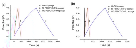 Charge-discharge (CD) testing curves of symmetric supercapacitor cells assembled with GtPU, 50 PEDOT/GtPU and 110 PEDOT/GtPU sponge (a), GnPU, 50 PEDOT/GnPU and 110 PEDOT/GnPU sponge (b). CD curves were all obtained with the current density of 0.1 mA cm−2.