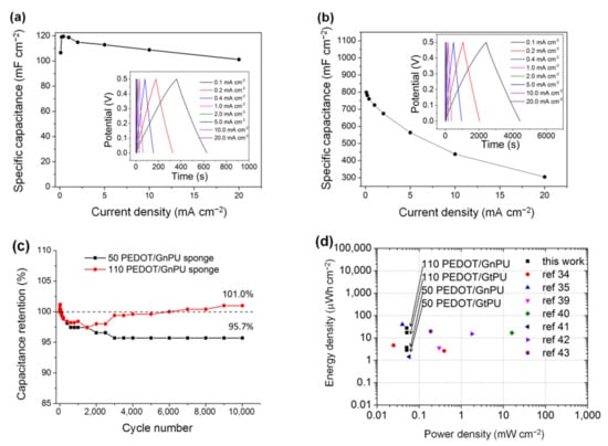 We further studied 50 PEDOT/GnPU and 110 PEDOT/GnPU with CD tests from 0 to 0.5 V with current density from low 0.1 mA cm−2 to high 20 mA cm−2. The calculated specific capacitance values under varied current densities are shown in Figure 8a,b. After a small capacitance increase from 0.1 mA cm−2 to 0.4 cm−2, the specific capacitance of 50 PEDOT/GnPU decreased slowly as the current density increased (Figure 8a). The capacitance increase was attributed to the self-activation of PEDOT, and the redox reactions on a small portion of PEDOT could not keep up with the applied current when current density increased. The specific capacitance obtained at 20 mA cm−2 was 101.2 mF cm−2, it was 94.9% of the initial value 106.6 mF cm−2 at 0.1 mA cm−2 and 84.7% of the highest value 119.5 mF cm−2 at 0.4 mA cm−2. The high capacitance retention at high current density confirmed the fast doping/de-doping process and low ion diffusion resistance of 50 PEDOT/GnPU. In Figure 8b, the specific capacitance of 110 PEDOT/GnPU decreased significantly as the testing current density increased. There was no increase observed at the first several tested current densities since the decrease caused by increasing applied current was dominating the performance. The capacitance value 304.8 mF cm−2 obtained at 20 mA cm−2 was 38.2% of the initial value 798.2 at 0.1 mA cm−2. The higher yield of PEDOT and nano-scale porous structure on 110 PEDOT/GnPU caused the lower conductivity and higher ion diffusion resistance than 50 PEDOT/GnPU. It was more difficult for 110 PEDOT/GnPU to keep up with the applied current, and more PEDOT in 110 PEDOT/GnPU could not respond to the applied current quickly compared 50 PEDOT/GnPU. Although the specific capacitance of 110 PEDOT/GnPU decreased significantly as the current density increased, the capacitance value of 110 PEDOT/GnPU was still higher than 50 PEDOT/GnPU at the highest tested current density of 20 mA cm−2.