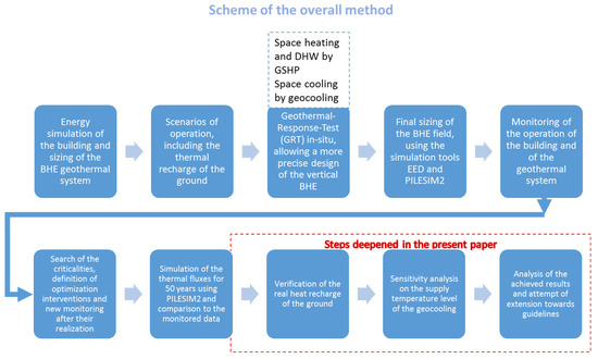 - Carrying out of the Geothermal-Response-Test (GRT) in-situ for a detailed study of the thermal characteristics of the ground according to [23]; the GRT allows a more precise evaluation of the length of the vertical BHE. When it is properly determined, supplementary costs are avoided;