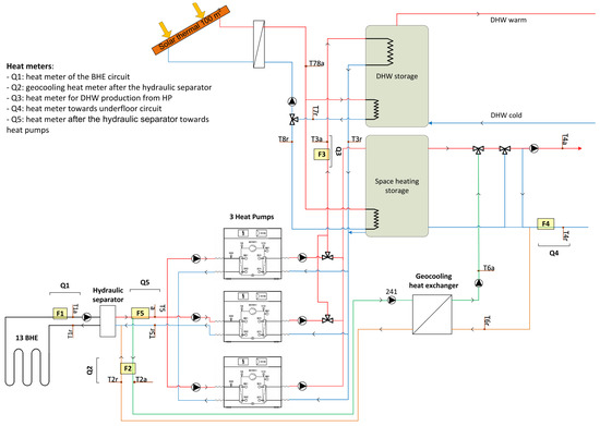 - Q1: heat meter of the BHE field. This is necessary for the monitoring of the thermal exchange with the ground. In this counter, water with glycol circulates;
