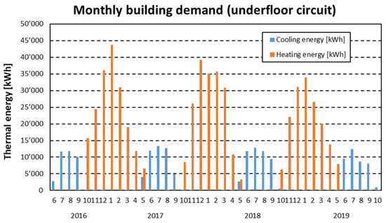 - Final dimensioning of the BHE field, using updated thermal needs and ground properties found by the GRT, by the simulation tools EED [24] and PILESIM2 [16]. The system was realized for providing space heating and DHW by GSHP, together with a solar thermal plant. The cooling demand of the building was expected to be satisfied with geocooling technology that can as well as recharge the ground.