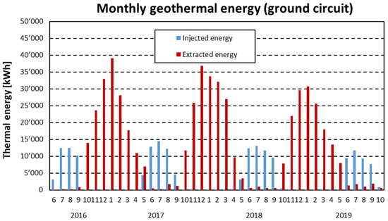 - Pahud, D.; Caputo, P.; Branca, G.; Generelli, M. Etude du Potentiel D’utilisation de “Geocooling” D’une Installation Avec Sondes Géothermiques Verticales Appliqué à un Bâtiment Administratif Minergie à Chiasso; Rapport Final; Office Fédéral de L’énergie: Berne, Switzerland, 2008; Available online: https://www.aramis.admin.ch/Default?DocumentID=63151 (accessed on 5 November 2021). (in French)