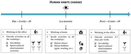 The assumption was to select three human behaviours, representative of the changes in lifestyle that occurred in this pandemic. The choice was made, taking into account two particular aspects—work and social life. Regarding work, the Italian government adopted legislative prescription to avoid infection diffusion, promoting “smart working” at home and determining great changes in the lifestyles of workers. In fact, if during the pre-COVID-19 period, staying in the office was substantially diffused, after that, many public and private companies adopted remote solutions to guarantee the safety and health of their employees. At the same time, this action brought some indirect consequences, such as savings, in terms of management costs, and a better quality of life for commuters, leading to the adoption of this kind of work even when the pandemic situation had improved. The second aspect to be considered is the change in sociability, due to the closures of all meeting places (gyms, theatres, cinemas, etc.) and the reduction of outside activities that improved home hobbies and chores.
