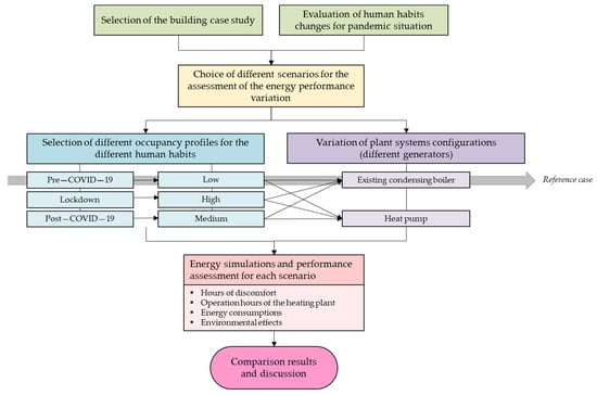 The comparison between hours of discomfort, energy consumption, and environmental impacts related to different human habits, pre- and post-COVID-19 pandemic, requires a methodology that considers different scenarios, changing the significant parameters related to these aspects.