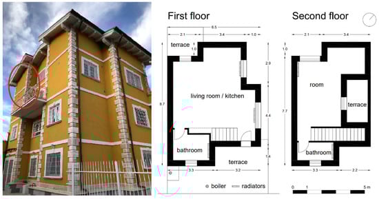A unit apartment located in a three-storey building in Rome was chosen for the analysis, as representative of a widespread apartment typology. According to [], the most diffused and best-selling flats have useful areas between 50 and 85 m2, especially in the biggest cities of Italy. Moreover, according to the Italian census (ISTAT), more than five million existing Italian buildings are multi-storey buildings, consisting of various apartments on each floor []. The case study has a net surface of 60 m2 and it is located on the second floor of the building, with an independent entrance through external stairs. The apartment has an open space for the kitchen, dining, and living rooms, and a bathroom on the lower floor. Internal stairs lead to the bedroom and the second bathroom on the upper floor (Figure 4).