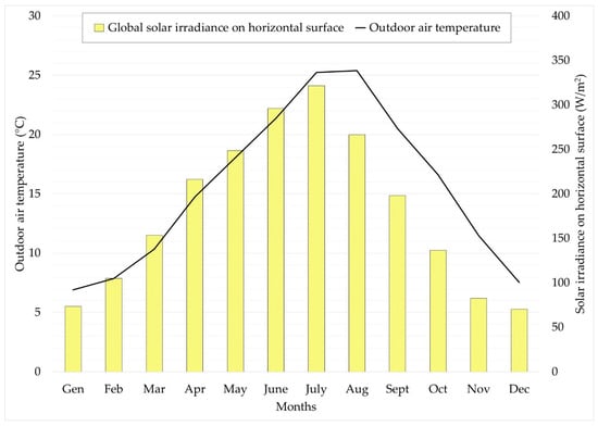 As aforementioned, the energy simulations were carried out in climatic zone D (heating period from 1 November to 15 April), taking, as reference, the city of Rome, characterized by 1642 degree days. The validation of the model was performed by taking into account the real climatic conditions related to the monitored period [], whilst the current analysis was carried out adopting the climatic data provided by [] (Figure 5), in order to consider the whole year.