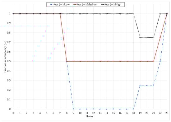Occupancy fraction profiles for the different scenarios analysed (low, medium, and high).