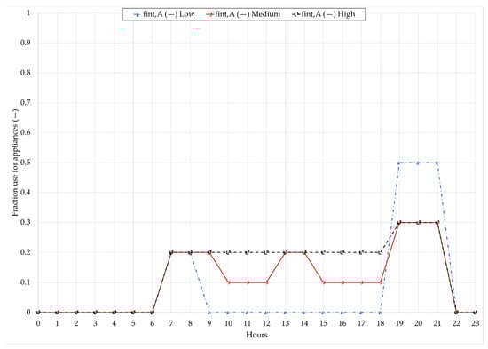Fraction of appliance uses for the different scenarios analysed (low, medium, and high).