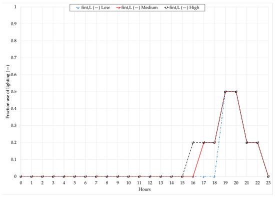 Fraction of lighting use for the different scenarios analysed (low, medium, and high).