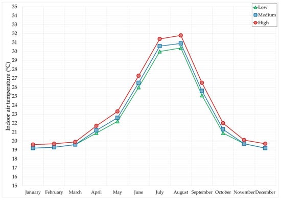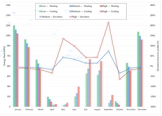 The internal thermal load (returned by energy simulations) of the medium and high profiles are, respectively, (on average) +58% and +149% higher than the internal load of the low profile (reference case), and, according to the UNI EN ISO 52016 calculation method, this affects the indoor air temperature. Figure 9 shows the mean indoor air temperature reached in each month of the year by adopting the low (green line), medium (blue line), and high (red line) occupancy profiles, confirming that the greater the indoor thermal loads (linked to occupancy profiles), the higher the indoor air temperature. In fact, as expected, the mean indoor air temperature tends to increase with the level of occupancy profile (the more time spent in the house, the more internal heat load); in particular, compared to the low profile (reference profile), the increase is up to 2.0% and to 5.6% for medium and high profiles, respectively. Nevertheless, the indoor air temperatures obtained with medium and low profiles tend to correspond during the coldest months (from November to February) although the indoor thermal load of the medium profile is higher (about +55%, considering only the heating period). On the other hand, the high profile gives an air temperature trend shift of at least 0.5 °C in the coldest months.