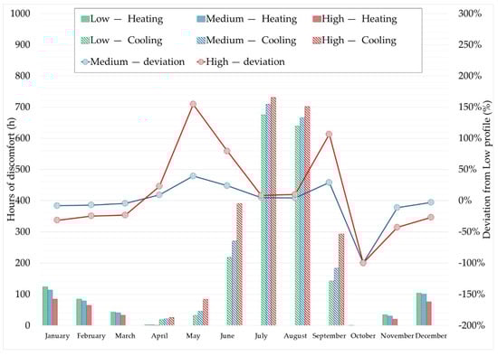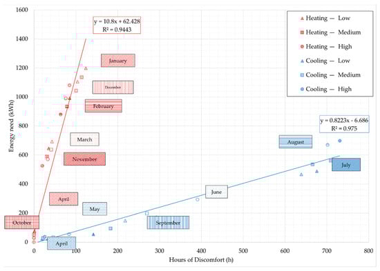 - Hours of discomfort, evaluated as the number of hours in which the indoor operative temperature was lower (heating), or higher (cooling), than the set point values;