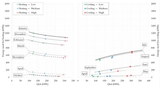 According to this description, the energy assessment with the hourly calculation procedure should be more accurate; further studies should be carried out by varying the climatic zones and thermal properties of the building envelope []. According to previous papers that analysed the application of the hourly calculation procedure to different types of buildings [,,,,,,], the energy outcomes significantly varied with the thermal properties of the building envelopes, use of buildings, and outdoor thermal conditions, making a comparison between these works difficult [].