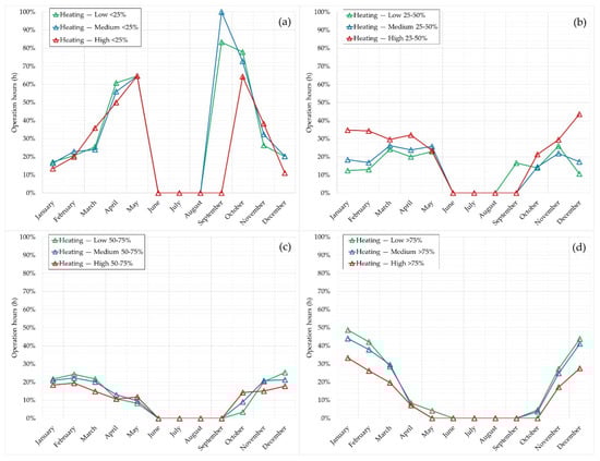 In detail, the so-called “low” profile is characterized by a low occupancy rate of the apartment, more concentrated during evening and night hours, beginning from 19:00 until 7:00 in the morning. It is typical of a young worker, who does not stay in the house during work hours, and is often implied in social and sports activities. Moreover, this profile is calibrated and coherent with the actual use profile of the house monitored in [], before the COVID-19 pandemic. For this reason, it was assumed as the reference profile for the comparison results.