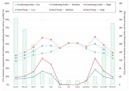 For this reason, each defined scenario was simulated, substituting the existing condensing boiler with a heat pump. Its sizing was chosen, satisfying the DHW requirements and the heating energy loads according to [,]. The heat pump system supplies both the heating and DHW production and has a rated heating capacity of 7.74 kW and a coefficient of performance (COP) of 4.75.