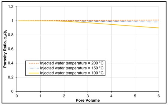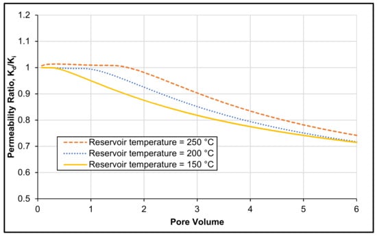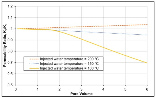 Figure 5 shows that when the temperature of formation and injected water is 200 °C, permeability ratio in enhanced by 3%. However, when the injected water temperature is lower than the formation temperature (fixed at 200 °C), the formation permeability ratio is decreased by 31% and 6% for the injected water temperature of 100 °C and 150 °C, respectively.