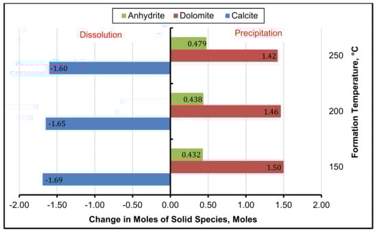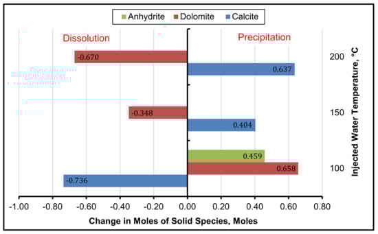 Figure 4 shows that at 150 °C the changes in moles were lowest for anhydrite and highest for calcite and dolomite. The impact of injected water temperature on