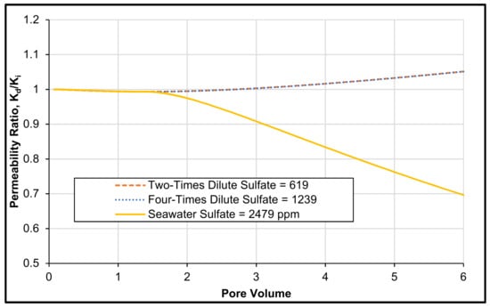 Figure 8 shows that the injection of seawater causes a reduction of geothermal reservoir permeability by 31%. However, for the other two cases (two- and four-times diluted sulfate) a formation permeability enhancement of 3% was recorded. This finding shows that the impairment of formation permeability can be controlled by decreasing the concentration of sulfate. Therefore, the amount of sulfate in the water should be monitored. Furthermore, as the two- and four-times diluted sulfate trends are exactly the same, one can conclude that the two-times diluted sulfate (1239 ppm of sulfate) is the optimum concentration; the composition of this optimum case is listed in