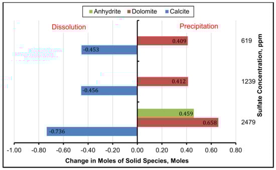 Figure 9 shows the effect of sulfate on the molar concentrations of calcite, dolomite and anhydrite. It is evident from the figure, that the increase in permeability using two- and four-times diluted sulfate concentrations is attributed to the absence of anhydrite formation and precipitation. One observes that the deposition of dolomite is 0.41 moles and that of calcite is 0.45 moles. However, the concentration of anhydrite is zero moles.