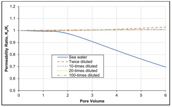 However, when the injected seawater is diluted, permeability increases by 6% for two-times diluted water and 1% for all other diluted waters (ten-times diluted water, twenty-times diluted, and hundred-times diluted water). Thus, the highest enhancement of porous media permeability is caused by the injection of two-times diluted seawater. This finding can be explained by the results presented in
