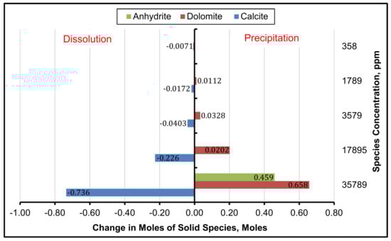 It is further observed that the dissolution of calcite surpasses dolomite precipitation. It is important to mention here that the temperature of the injected water and the concentration of sulfate are the controlling parameters for the precipitation of anhydrite and related permeability damage.