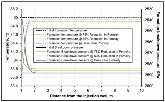 Figure 12. Moreover, the significant drop in temperature for 75% porosity reduction case leads to a substantial decrease in the formation breakdown pressure when compared to the other cases as presented in