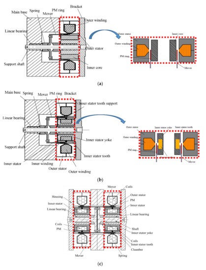 - Wang, J.; Howe, D.; Lin, Z. Comparative studies on linear motor topologies for reciprocating vapour compressors. In Proceedings of the International Electrical Machines and Drives Conference (IEMDC2007), Antalya, Turkey, 3–5 May 2007; pp. 364–369. [Google Scholar]