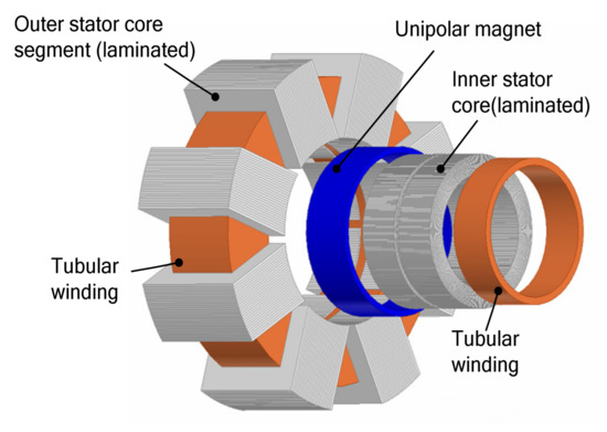 Figure 1 shows the motor topologies of the conventional model 1 and two proposed modular dual-stator PM linear motors as the proposed model 2 and model 3, respectively. Compared to the conventional PM motor in Figure 1a, the proposed models have an additional effective design of the inner stator tubular winding. In Figure 1b, the dual-stator dual-winding design is introduced as one effective way to improve motor output performance with limited design dimensions. As shown in Figure 2, two groups of stator tubular windings in both inner and outer stators are proposed in model 2, aiming to improve the motor thrust force density without increasing overall volume. In addition, model 3 utilizes the modular concept of the combination of two model 2 as Figure 1c to further increase the motor force density and fault tolerant ability, which contributes to the modular idea but not be taken into detail consideration in this research.