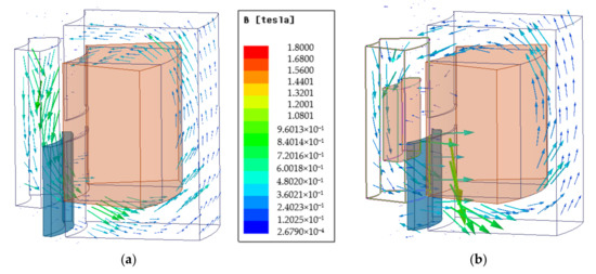 Figure 3 presents the flux density vector distributions in two models without current excitation to verify the original no-load flux loop design, where the mover is located at the starting point. The flux density distributions under the rated current excitation are shown in Figure 4, which are used to verify the design reasonability without core saturation in the full load condition. The ending position of mover is selected, because the core flux density achieves maximum at this moment. In addition, the flux density comparison demonstrates a higher and well distributed flux density in the inner stator of the proposed model 2 with the extra armature excitation in the inner stator.
