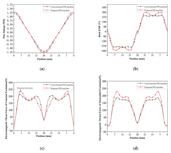 Moreover, Figure 5 shows the comparison waveforms of the winding flux, back-EMF, and thrust force of the two models. In the absence of current excitation, that is, when the motor is under no load, the two models are simulated to obtain the waveforms of flux linkage and the back-EMF. In order to evaluate the machine performance in different conditions, the thrust force waveforms is obtained under constant DC current excitation in Figure 5c, where sinusoidal current excitation is used in Figure 5d with the amplitude value same with DC current. In order to illustrate the basic characteristics of the mover clearly, simulations are operated with the same constant speed. Through formula (3), the motor running speed can be calculated is 2.8 m/s.