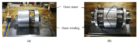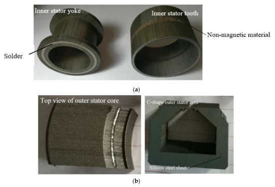 Figure 6a shows the photos of the motor inner stator yoke and tooth segments separately, where the tooth segment will be assembled to the yoke segment after the inner stator tubular winding wound. Moreover, a non-magnetic material mass with 3 mm length is used to support the airgap between the inner stator teeth shoes. This kind of new manufacture technique in circumferential direction core lamination is firstly used for easy tubular winding layout. Two modular prototypes of the proposed model 2 and model 3 are manufactured as in Figure 7a,b, respectively.
