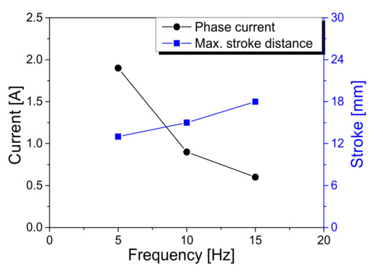 Table 3 illustrates basic experimental results compared to the original designed results of model 2 to verify the prototype suitable for the linear compressor application. Due to the control board limitation, experimental results under a relative low voltage and low frequency range were tested as in Figure 8. The motor characteristics of maximum stroke distance and maximum air pressure in the air cylinder are illustrated to show the basic characteristics with low frequency operation.