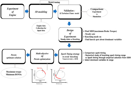 To select the optimization range, the effect of variations in the spark timing and boost pressure on the occurrence of knocking was determined. To predict the occurrence of knocking, DoE was applied, together with the spark timing obtained through a numerical simulation and boost pressure selected based on experimental data. Subsequently, the phenomena associated with changes in each variable were predicted.
