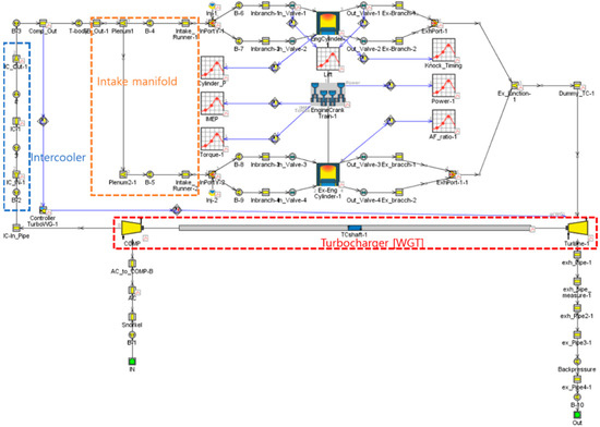 The experiments were conducted to obtain input data before proceeding with the 1D modeling. Figure 2 shows a schematic of the device used in the experiment. The experimental equipment consisted of two main parts: the engine control part and the engine performance and exhaust gas analysis parts. The engine control system consisted of an AC dynamometer that was enclosed by the rest of the components, i.e., the intercooler (AVL ConsysBoost 3000), fuel (AVL FuelExact PLU 500), oil (AVL ConsysLube 50), and coolant (AVL ConsysCool 450) control system. The experiments were conducted using a combustion indicator (AVL Indiset Advanced Gigabit) and an exhaust gas analyzer (AVL AMA i60) installed for exhaust gas analysis and performance analysis. The experiments were carried out with a wide-open throttle (WOT) state in a total of 10 sections at engine speeds varying from 1600 RPM to 5500 RPM, and data for the 1D modeling was obtained. The testing was performed by the Korea Automotive Technology Institute, KATECH.