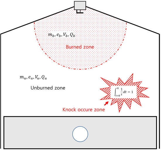 Equation (9) is referred to as the induction time integral or Livengood and Wu’s auto-ignition integral, and is expressed as Figure 4 when knocking occurs [25]. At this time, is the induction time at the instantaneous temperature and pressure of the mixture, t is the end-gas compression start (t = 0), and is the auto-ignition time. Equation (9) shows that, in a given mixture, the induced period chemical reaction is possible only in a gaseous state with the total production rate of important chemical species. It is obtained under the assumption that the concentration of important chemical species is constant at the start of auto-ignition. Equation (10) is obtained through various experimental formulas for hydrocarbon or mixed fuels for a specific induction time.