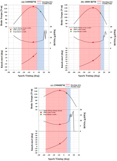 Figure 6 shows the variations in the maximum brake torque (MBT) point and torque change tendency, NOx emission, and knock onset prediction tendency for each RPM at various spark timings.