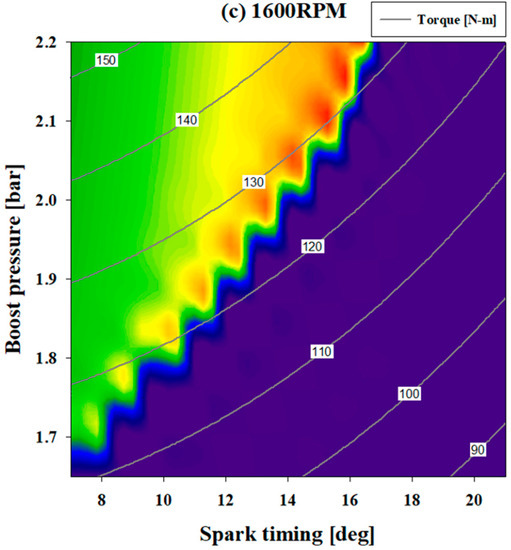 As shown in Figure 7a, it is possible to confirm the range of the allowed boost pressure and knock onset crank angle for the spark timing. In the GT-suite, the crank angle at which knocking does not occur is expressed as 0. The left area is the knock onset section based on 0, and the purple area is the area where knocking does not occur. For a spark timing of 7° CA, it was predicted that knocking occurred when the boost pressure exceeded 1.65 bar. It was confirmed that no knocking occurred at a spark timing of 17° CA, which is 10° CA retarded, at all the boost pressures. Figure 7a confirms, that when the spark timing was retarded by 1° CA, knocking did not occur, and the allowable boost pressure increased by 0.5 bar. However, the optimal spark timing for each of the boost pressures cannot be selected when selecting the range of optimal variables for spark timing and boost pressure. The spark timing and boost pressure ranges were selected based on NOx so that a good torque response and low emissions could be obtained even at low RPM for turbo gasoline engines that are applied to non-road vehicles. Figure 7b shows a contour of the variation in the NOx emissions with variations in the spark timing and boost pressure at 1600 RPM. When checking the amount of NOx generated after a spark timing of 19° CA (aTDC), it can be seen that the change width exhibits a rapidly changing trend. It can be determined that, irrespective of the effect of boost pressure, the combustion in the cylinder is incomplete owing to the excessively retarded spark timing. Therefore, the spark timing from 19° CA to 21° CA (aTDC) was excluded from the optimization range. Figure 7c shows the variation in the torque with changes in the two variables. In selecting the section, the lowest torque limit was set to 96.62 N-m or higher. This was −5% of the experimental value, which was 101.7 N-m. It was confirmed that, from 11° CA to 15° CA (aTDC), generating a high torque at the lowest boost pressure was possible. In addition, as it is possible to confirm that the higher the boost pressure, the higher the torque, it was confirmed that the spark timing of 12° CA (aTDC) is allowed by checking the section allowing the boost pressure to be higher than the experimental value of 1.65 bar. The optimization range at 1600 RPM was selected based on the results shown in Figure 7a–c. The optima spark timing range was from 12° to 15° CA (aTDC), and the optimal boost pressure range was from 1.65 to 1.85 bar.