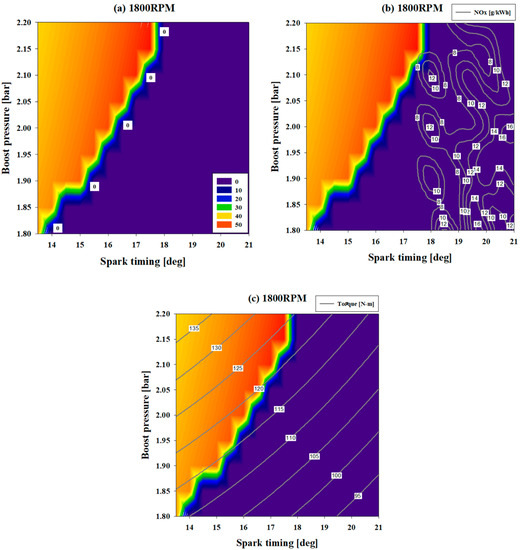 In Figure 8a, the knock onset area is on the left side of the purple area. The allowable boost pressure increased by 0.5 bar each time the spark timing was retarded by 1° CA from a spark timing of 14° CA, at which knocking does not occur at the experiment boost pressure value of 1.8 bar. A similar tendency was observed at 1600 RPM. The spark timing range at which all the pressures in the range 1.8–2.2 bar set in the DoE range are allowed is from 17.5° CA to 21° CA (aTDC). However, based on Figure 8b, combustion is unstable after a spark timing of 18° CA (aTDC). Based on this, the spark timings after 18° CA are not suitable as optimization variables. The results of the torque to be confirmed by other considerations are shown in Figure 8c. The lowest torque limit criterion was set as 107.73 N-m, which is −5% of the error range of the experimental torque value, 113.4 N-m. In Figure 8b, the range of the optimization variables was confirmed, except for the timing after a spark timing of 18° CA, which was confirmed by the NOx amount. It can be seen that a suitable spark timing range is 15–16° CA (aTDC). In the range of spark timing with the limit torque value set in Figure 8c, the range of the acceptable boost pressure is narrow. Therefore, although it is lower than 107.73 N-m, which was set as the experimental minimum torque limit standard, the timing value of 18° CA was allowed, as it can be supplemented by an increase in boost pressure. By synthesizing this, an optimization range for 1800 RPM was selected. The optimal spark timing was selected from 15.5° CA to 17.5° CA (aTDC), and the optimal boost pressure was selected from 1.8 bar to 2 bar as the range of variables for optimization.