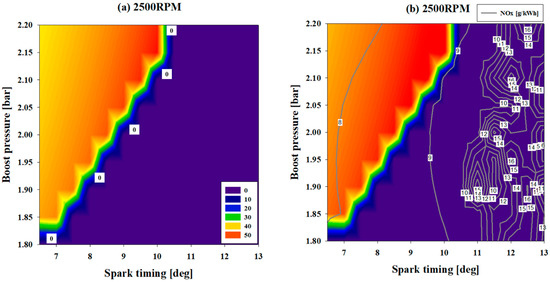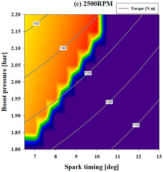 Figure 9 shows the knock onset contour that appears according to changes in the spark timing and boost pressure at 2500 rpm. The purple area represents the area where knocking does not occur, while the left area represents the area where knocking occurs at various spark timings and boost pressures.